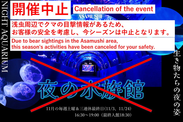11月の毎週土曜&三連休最終日16:30~19:00に期間限定で開催予定でありました「夜の水族館」につきまして、浅虫周辺にツキノワグマの目撃情報があるため、お客様の安全を考慮し11/15(土)以降の開催を中止することとなりました。ご来館を予定されていた皆様におかれましては、大変ご迷惑をおかけし申し訳ございませんが、何卒ご了承くださいますようお願い致します。
