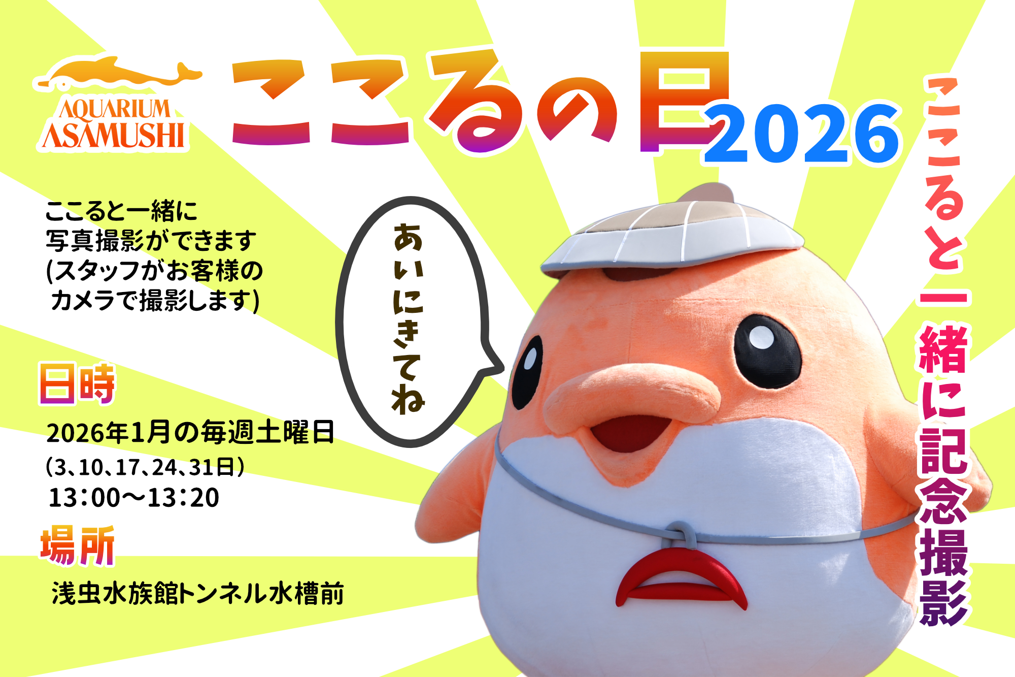 トンネル水槽スクリーン前に当館マスコットキャラクター「ここる」が登場します。「ここる」と触れ合ったり、記念撮影ができます(お客様のカメラをお預かりして撮影することも可能です)。ぜひ「ここる」に会いに来てください!【開催日】令和8年1月の毎週土曜日(3、10、17、24、31)13:00~13:20【場 所】トンネル水槽前