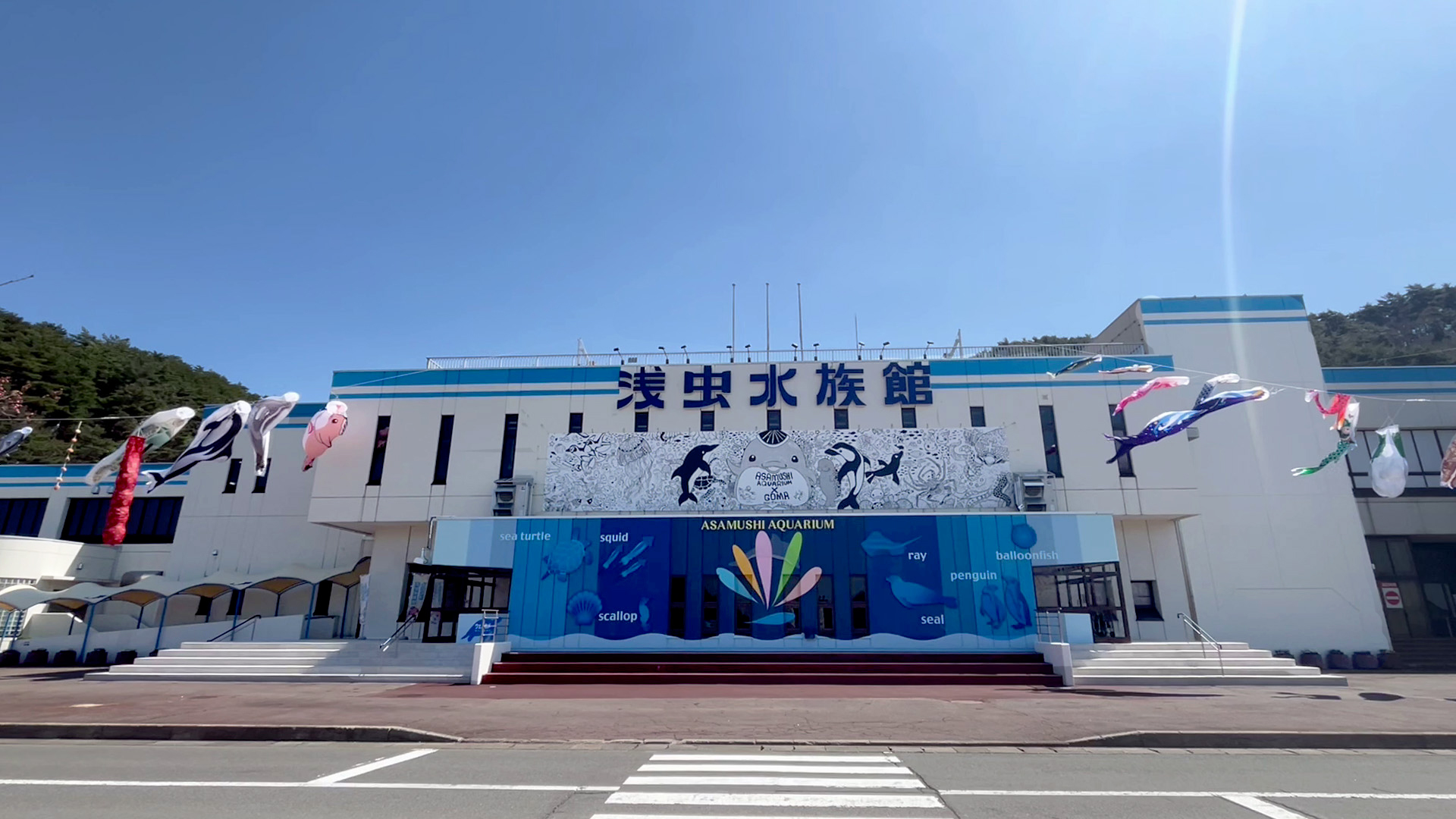 浅虫水族館オリジナルの、こいのぼりならぬ「いるかのぼり」たちが浅虫水族館正面に掲揚されます。